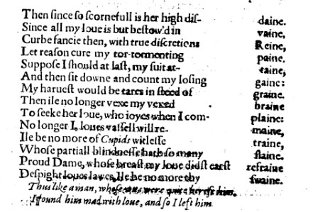 <L>Thine babling Eccho, would thy tongue told true: rue.</L>